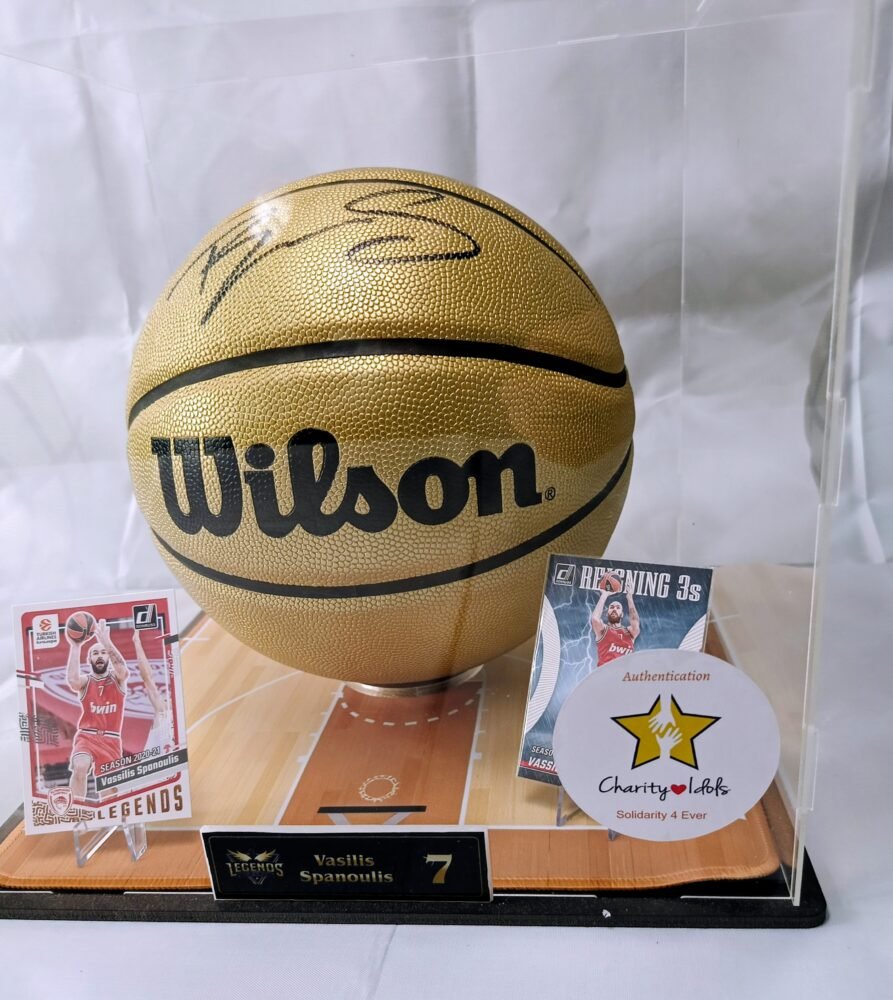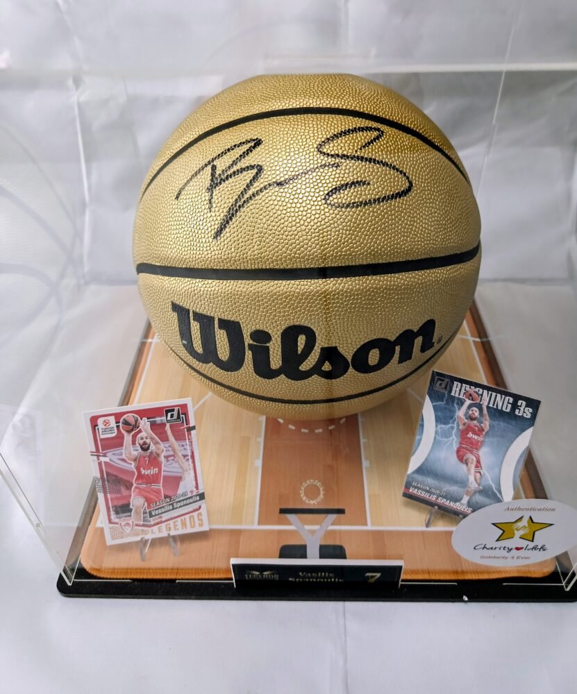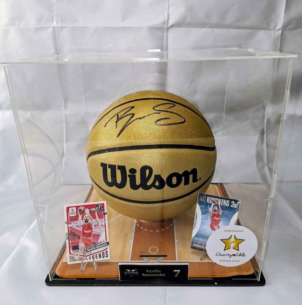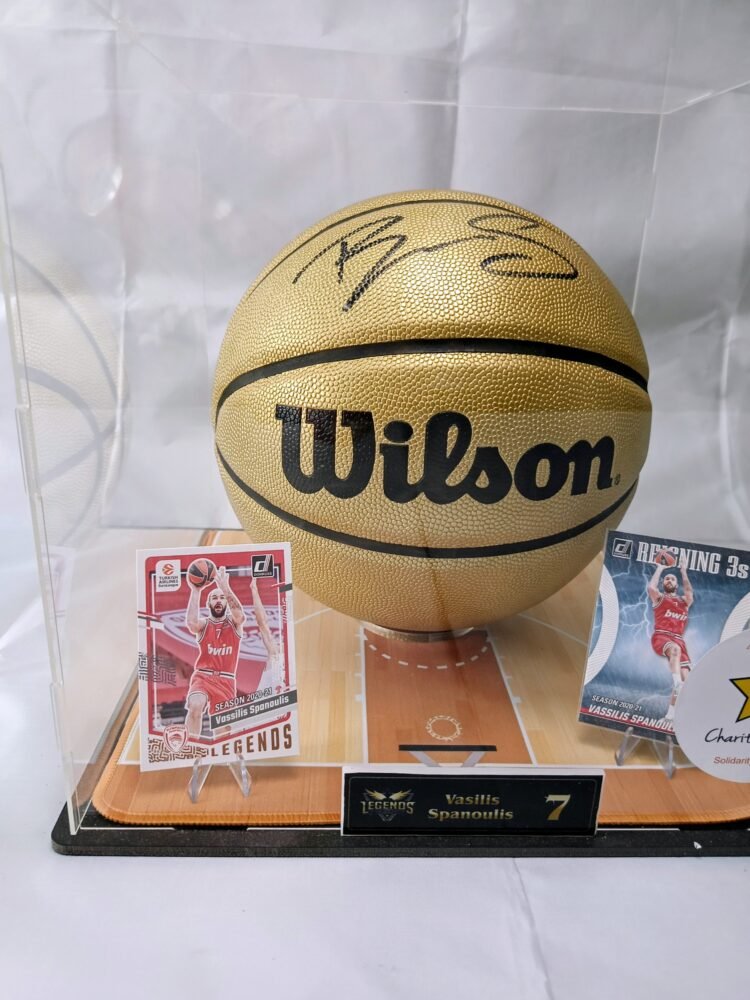 COLLECTABLE OFFICIAL GOLDEN WILSON BASKETBALL IN A DISPLAY SIGNED BY THE LEGEND OF THE GREEK BASKETBALL VASILI SPANOULI