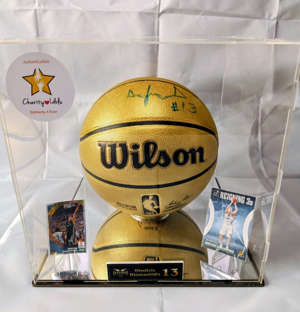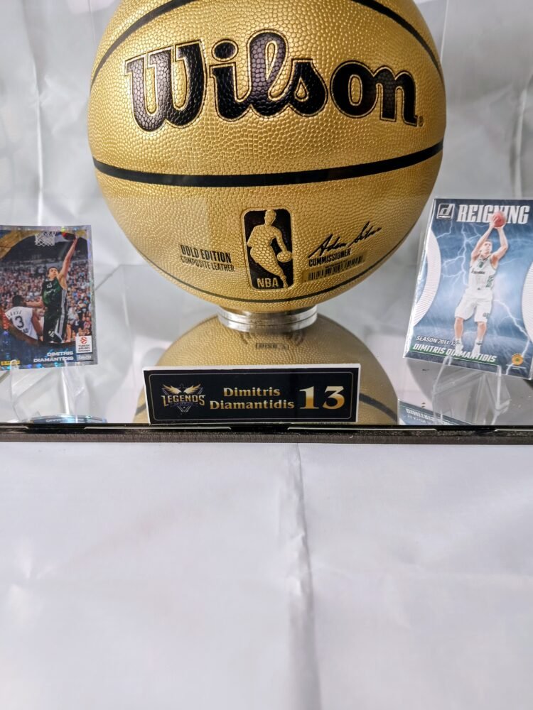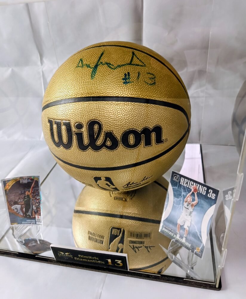 ΣΥΛΛΕΚΤΙΚΗ ΕΠΙΣΗΜΗ ΧΡΥΣΗ ΜΠΑΛΑ ΜΠΑΣΚΕΤ WILSON ΣΕ ΠΡΟΘΗΚΗ ΜΕ ΚΑΘΡΕΦΤΗ ΥΠΟΓΕΓΕΓΡΑΜΜΕΝΗ ΑΠΟ ΤΟΝ ΘΡΥΛΟ ΤΟΥ ΕΛΛΗΝΙΚΟΥ ΜΠΑΣΚΕΤ ΚΑΙ ΤΟΥ ΠΑΝΑΘΗΝΑΪΚΟΎ ΔΗΜΗΤΡΗ ΔΙΑΜΑΝΤΙΔΗ