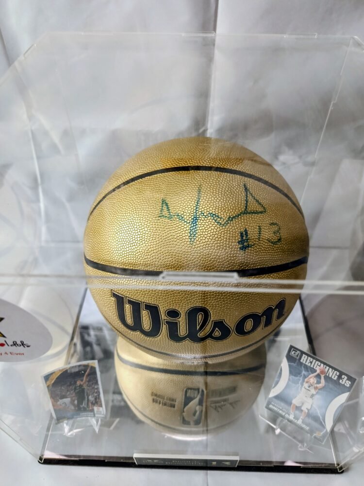 COLLECTABLE OFFICIAL GOLDEN WILSON BASKETBALL IN A DISPLAY WITH A MIRROR SIGNED BY THE LEGEND OF THE GREEK BASKETBALL DIMITRI DIAMANTIDI