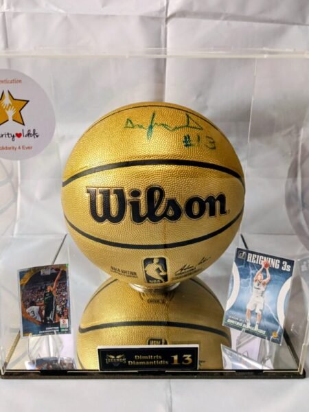 Dimitris DiamantidisCOLLECTABLE OFFICIAL GOLDEN WILSON BASKETBALL IN A DISPLAY WITH A MIRROR SIGNED BY THE LEGEND OF THE GREEK BASKETBALL DIMITRI DIAMANTIDI