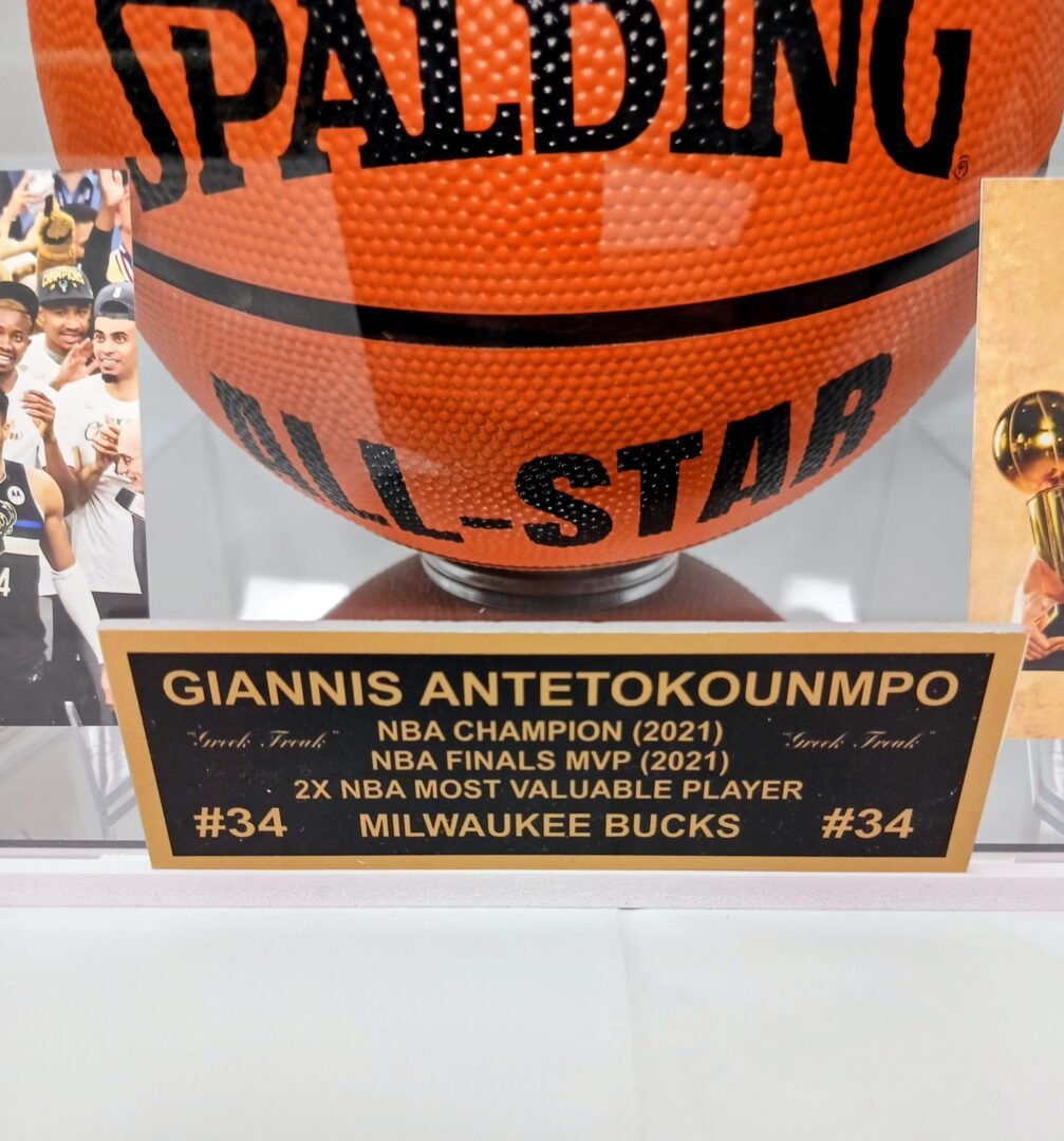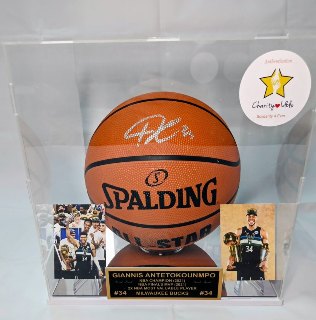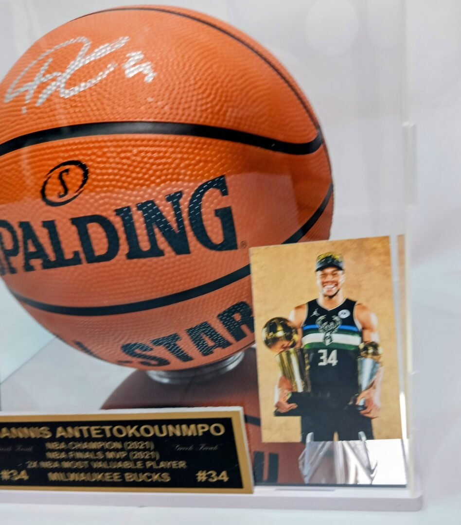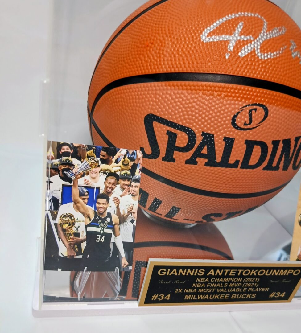 ΕΠΙΣΗΜΗ ΜΠΑΛΑ SPALDING ΣΕ ΘΗΚΗ ΠΛΕΞΙΓΚΛΑΣ ΜΕ ΚΑΘΡΕΦΤΗ ΥΠΟΓΕΓΡΑΜΜΈΝΗ ΑΠΟ ΤΟΝ ΣΟΥΠΕΡ ΣΤΑΡ ΤΟΥ ΝΒΑ ΚΑΙ ΤΗΣ ΕΘΝΙΚΗΣ ΕΛΛΑΔΑΣ ΓΙΑΝΝΗ ΑΝΤΕΤΟΚΟΎΜΠΟ