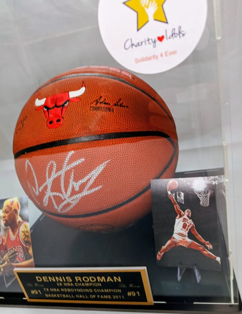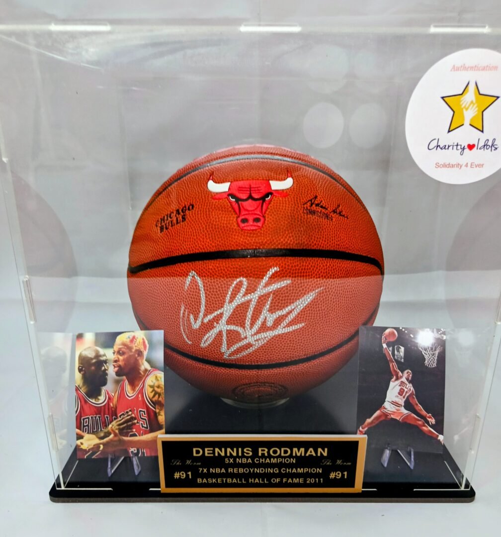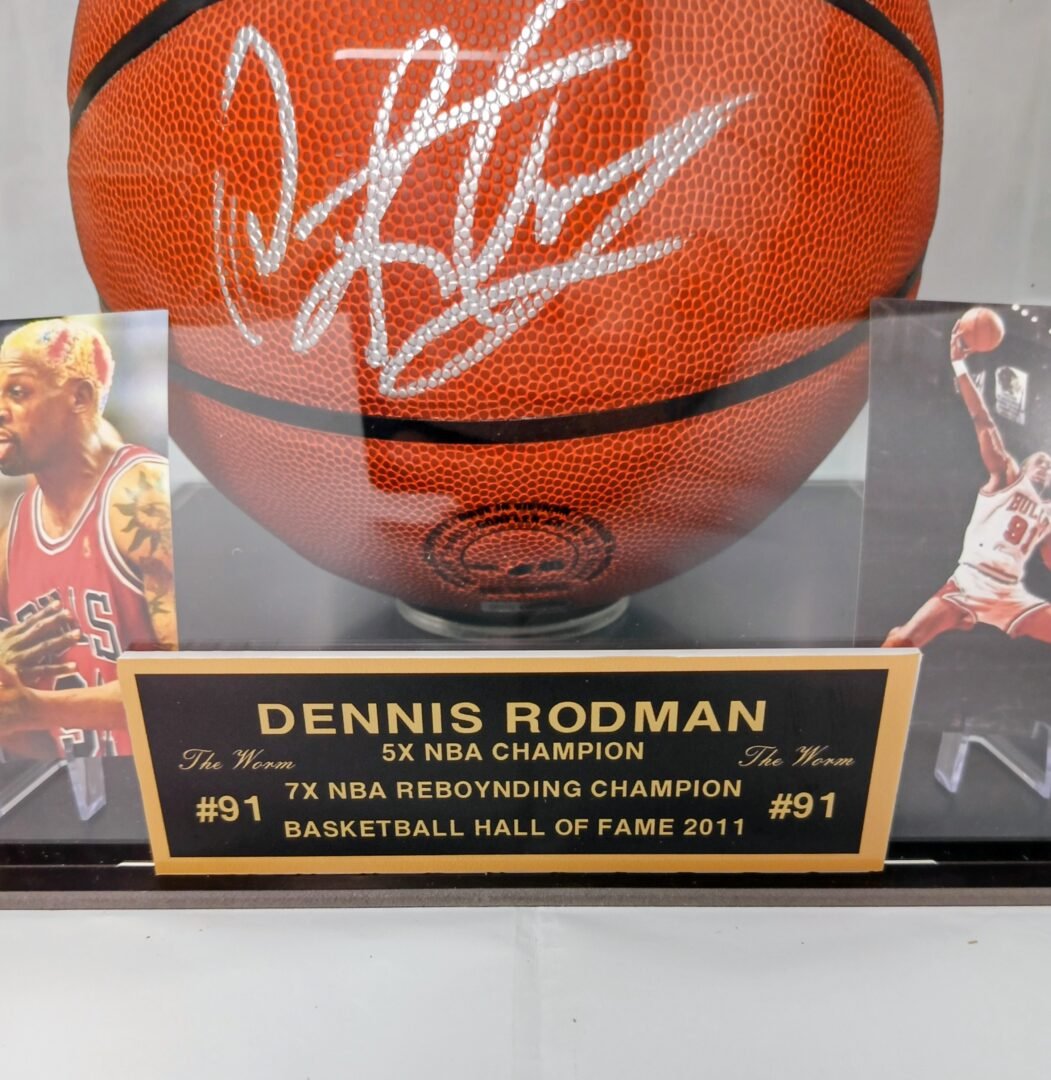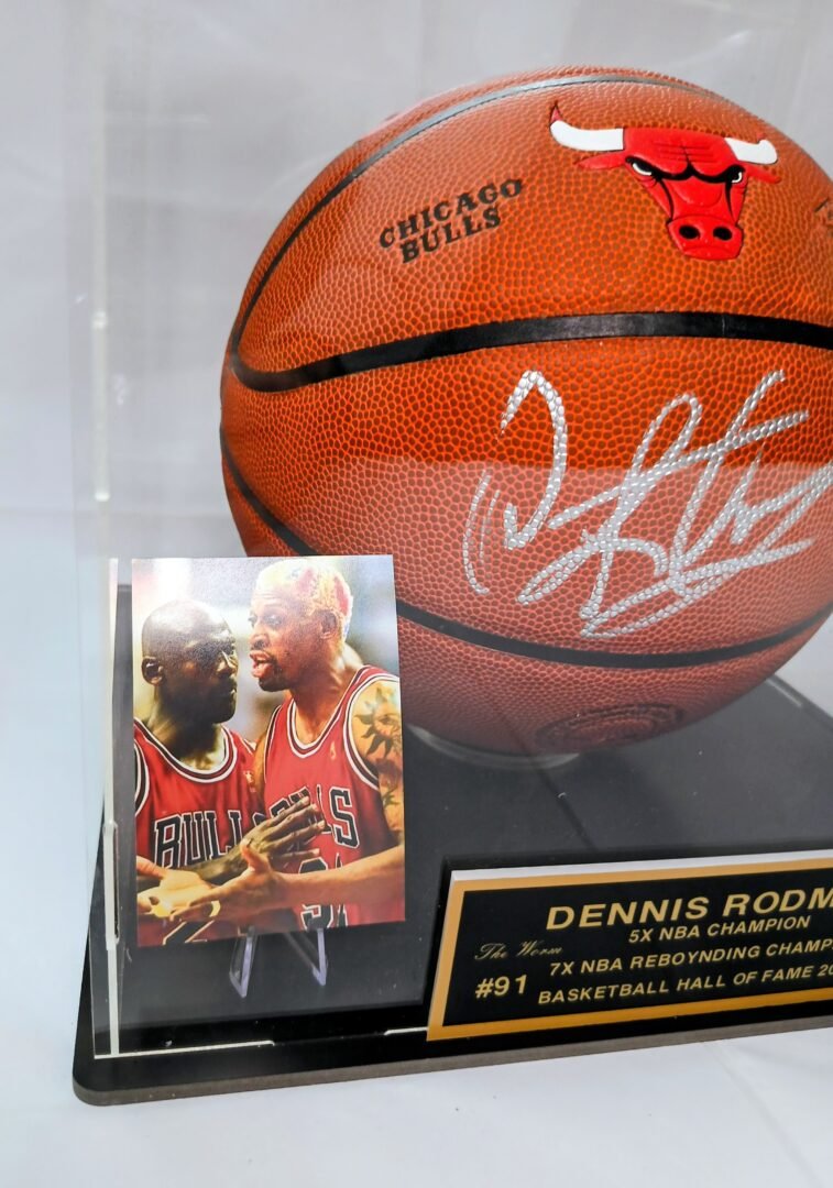 COLLECTABLE OFFICIAL WILSON BALL IN PLEXIGLASS DISPLAY SIGNED BY -5X NBA CHAMPION – 2X NBA ALL STAR -2X NBA DEFENDER OF THE YEAR AND HALL OF FAMER DENNIS RODMAN COA JSA