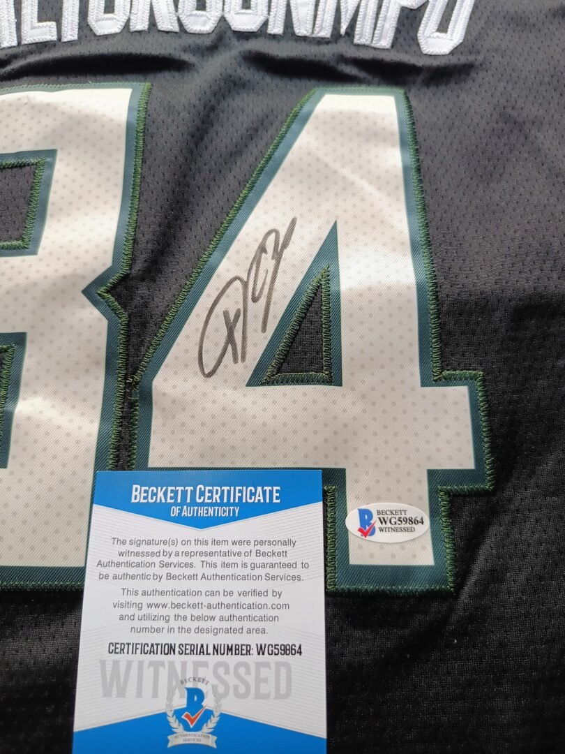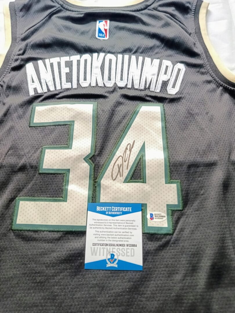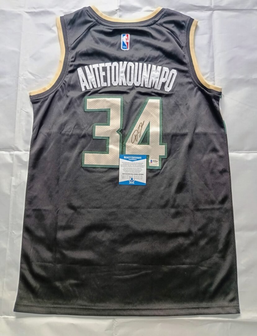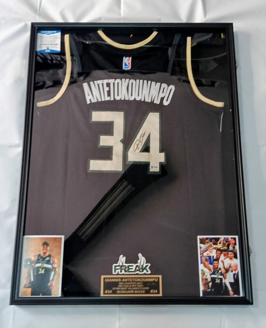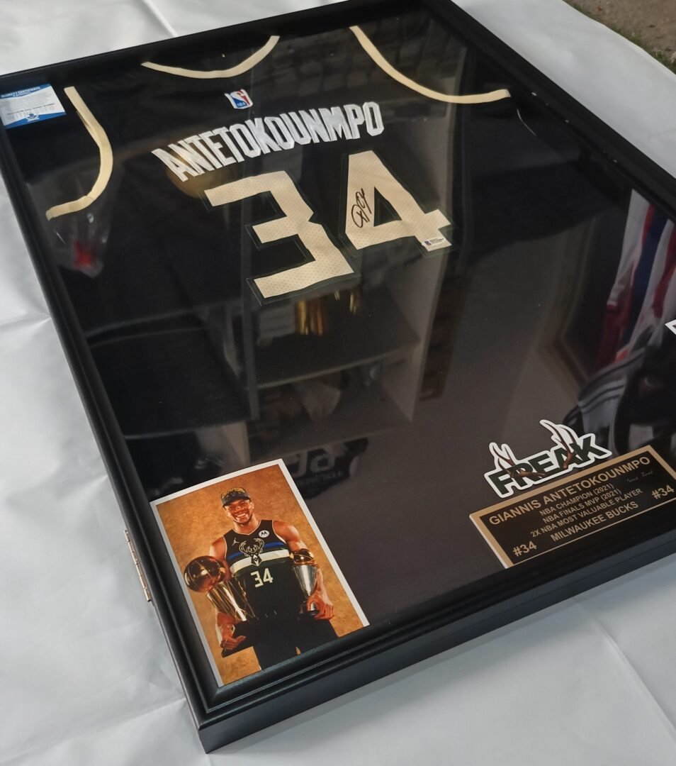 COLLECTABLE JERSEY OF 2021 CHAMPIONS MILWAUKEE BUCK’S FRAMED SIGNED BY THE 1X NBA CHAMPION 1X FINALS MVP 2X NBA MVP SUPER STAR OF GREEK NATIONAL TEAM GIANNI ANTETOKUNMBO COA BECKETT