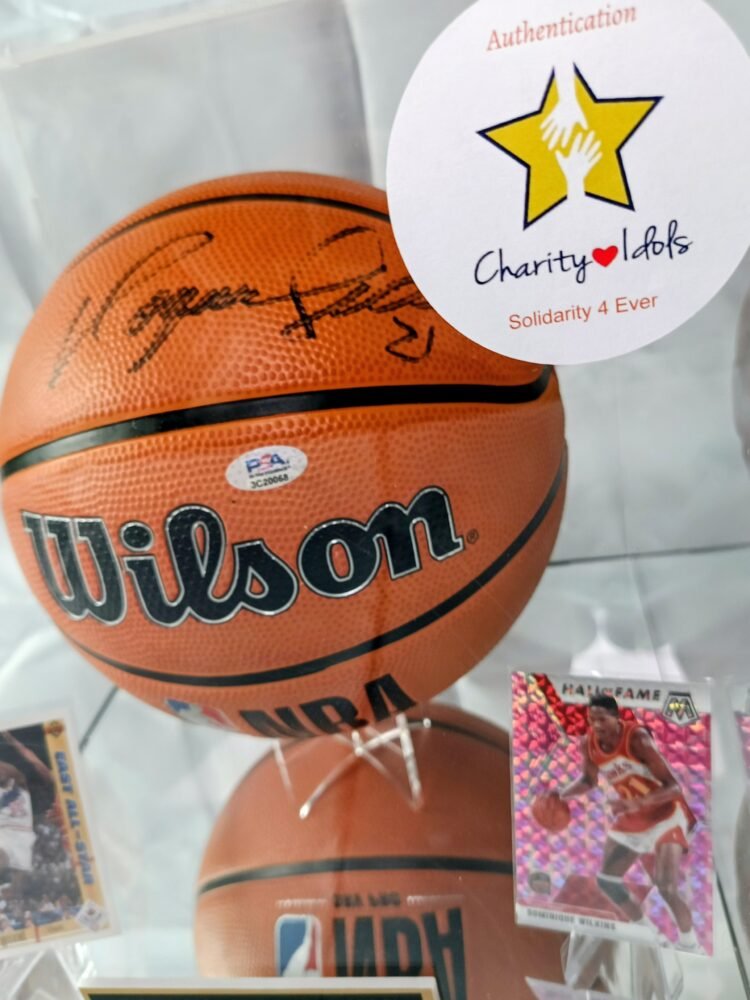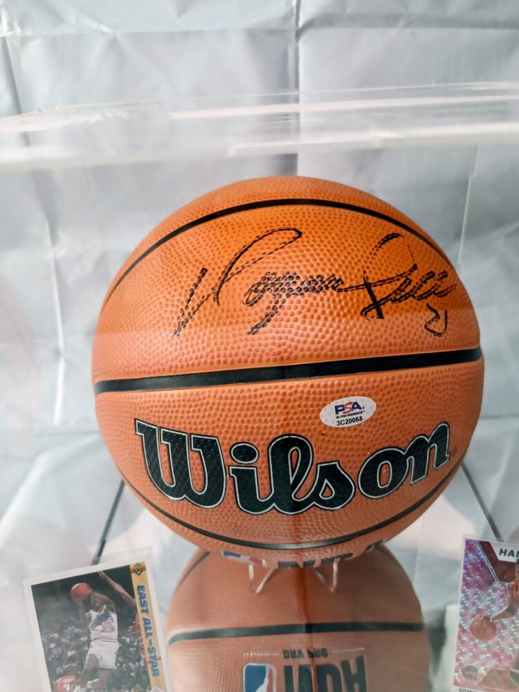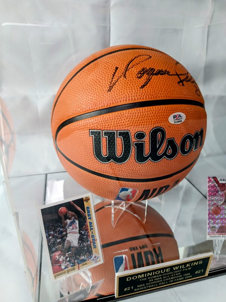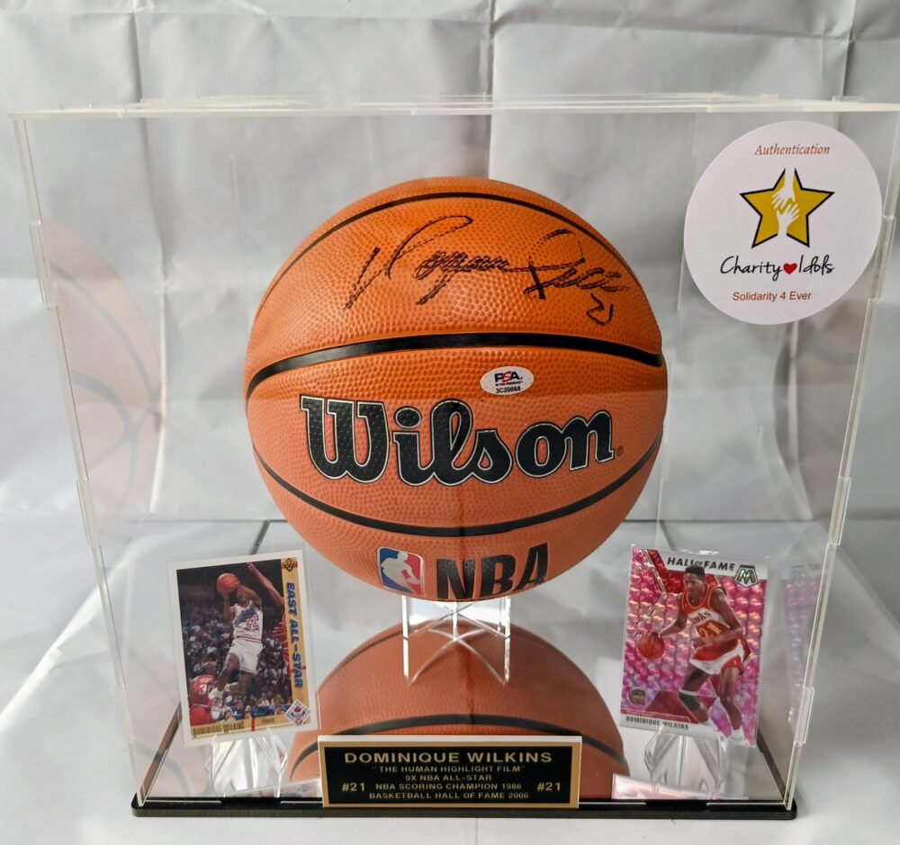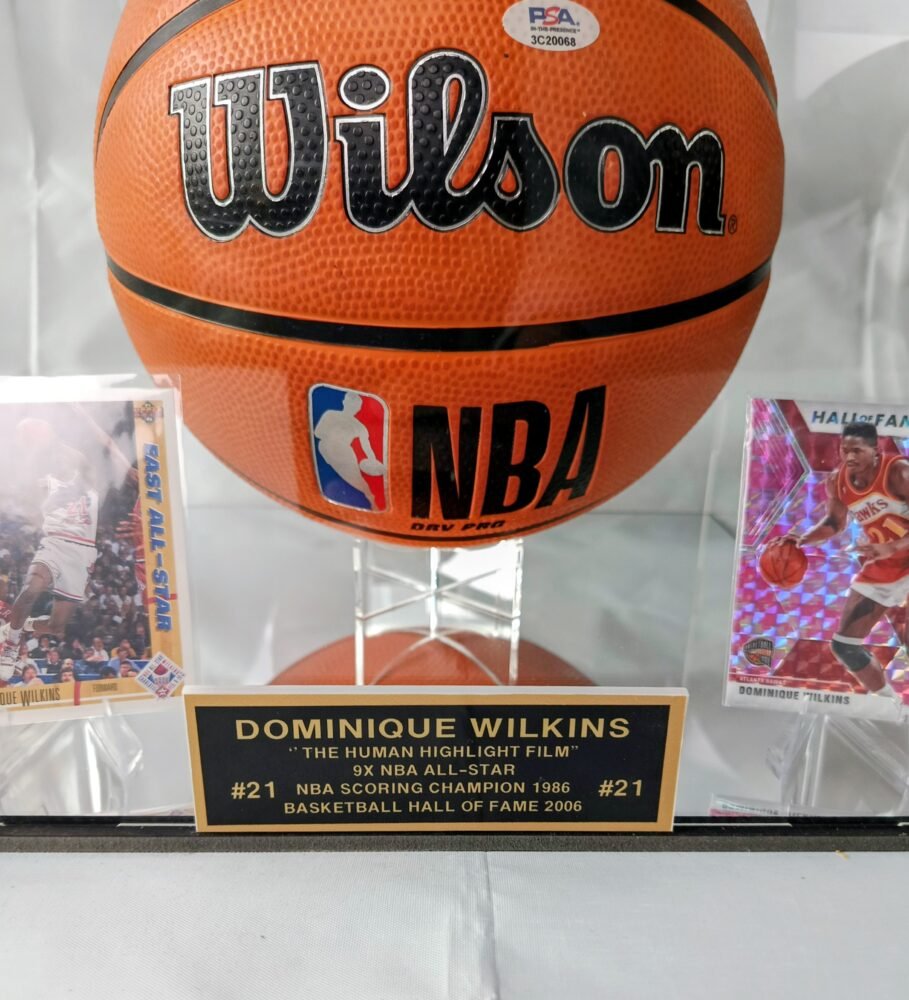 COLLECTABLE OFFICIAL WILSON BASKETBALL NBA EDITION IN A DISPLAY WITH A MIRROR SIGNED BY THE LEGEND AND HALL OF FAMER DOMINIQUE WILKINS