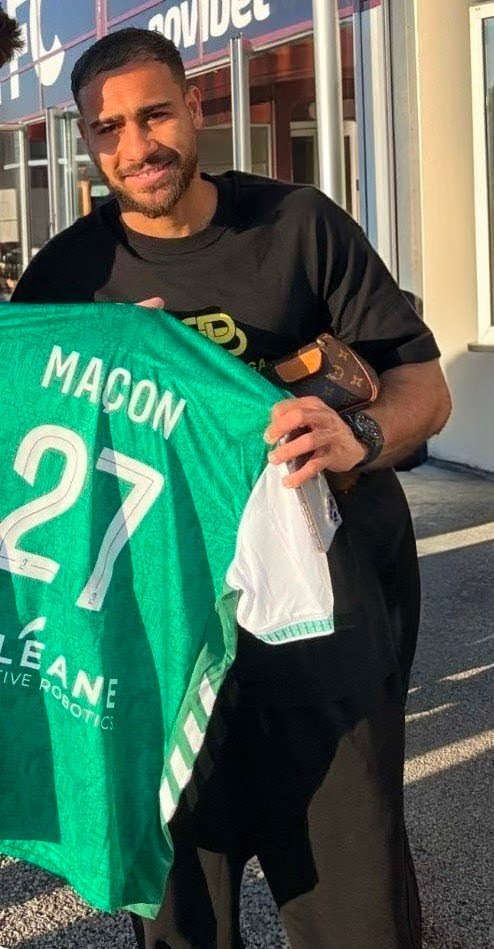 YVANN MACON (AEL NOVIBET PLAYER) – AS SAINT ETIENNE – OFFICIAL AND HAND SIGNED JERSEY – LIGUE 2 – SEASON 2025/2026